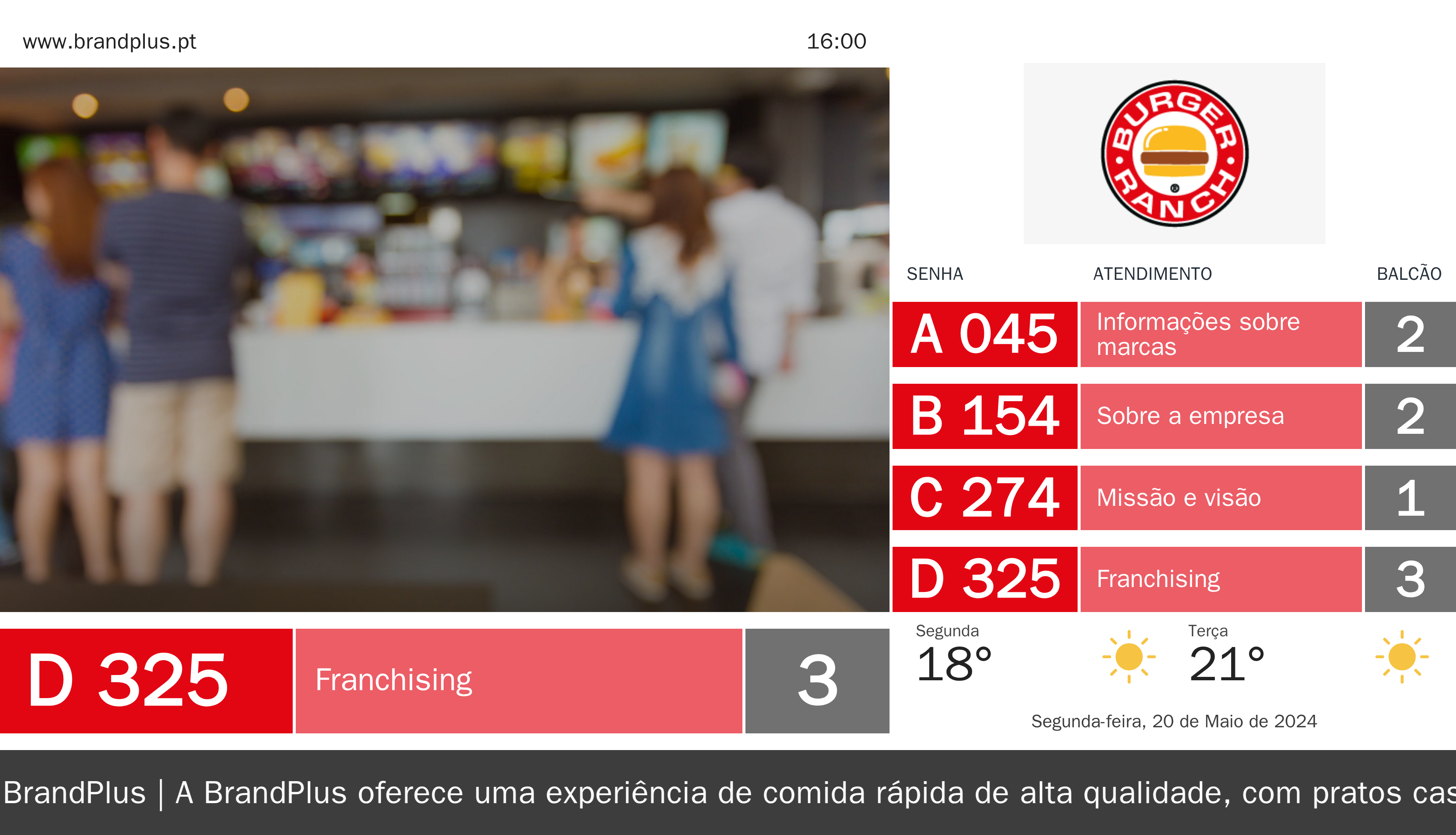 O Q.track é um sistema inovador que inclui quiosques de senhas, ecrãs de chamada e TV corporativa, permitindo um melhor fluxo de espera e uma experiência mais eficiente para os vossos clientes nas cadeias de fast food. Temos exemplos visuais, como o Q.kiosk e ecrãs alinhados à identidade da BrandPlus, que demonstram como a nossa solução pode ser integrada de forma harmoniosa na vossa marca.