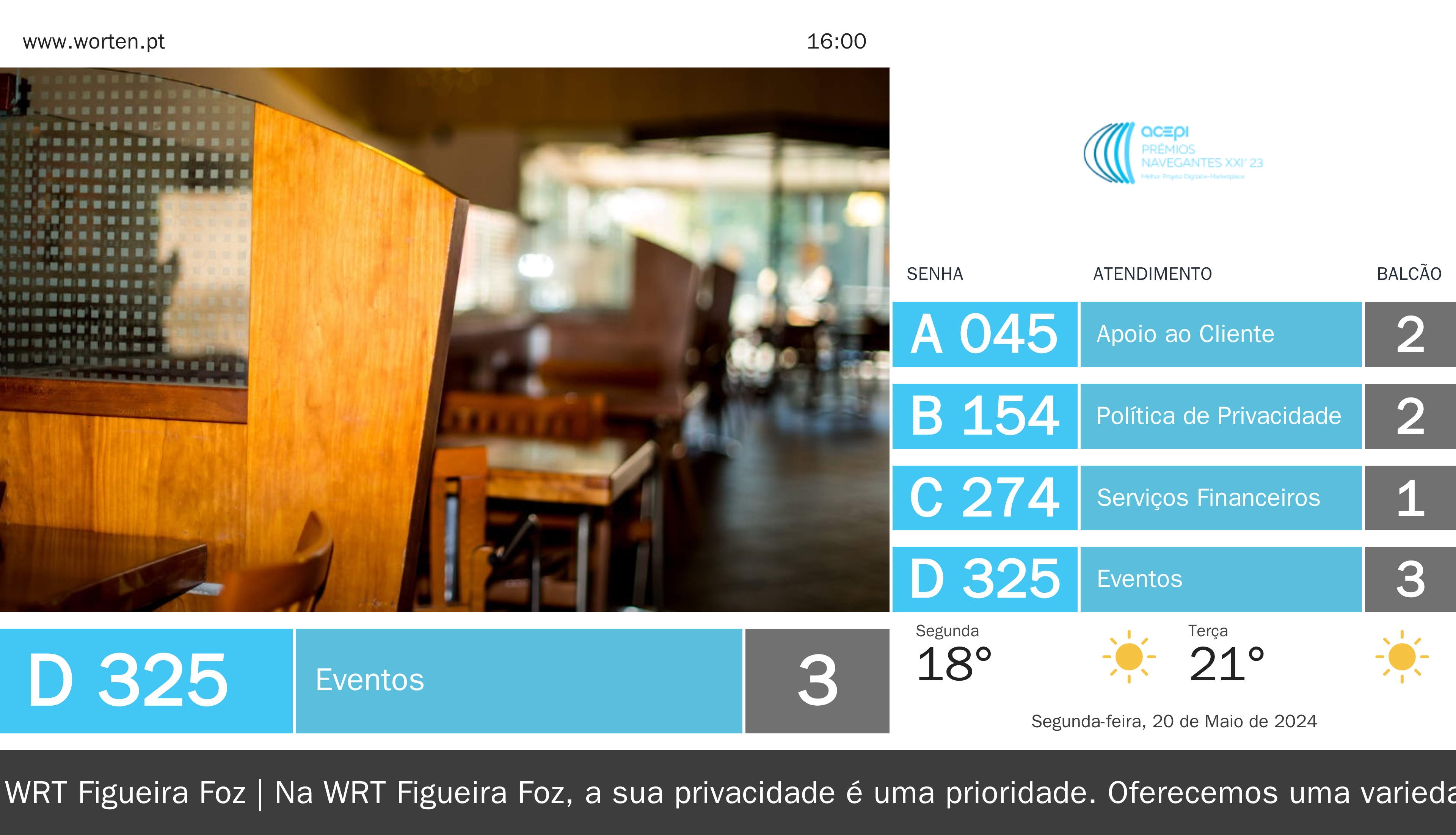 Com a Q.track, não só melhoram a gestão do tempo dos vossos clientes como também reforçam a vossa imagem institucional, alinhando os elementos visuais do sistema à identidade da WRT Figueira Foz. Temos exemplos visuais, como o Q.kiosk e ecrãs adaptados, que podem ser personalizados para refletir a vossa marca.