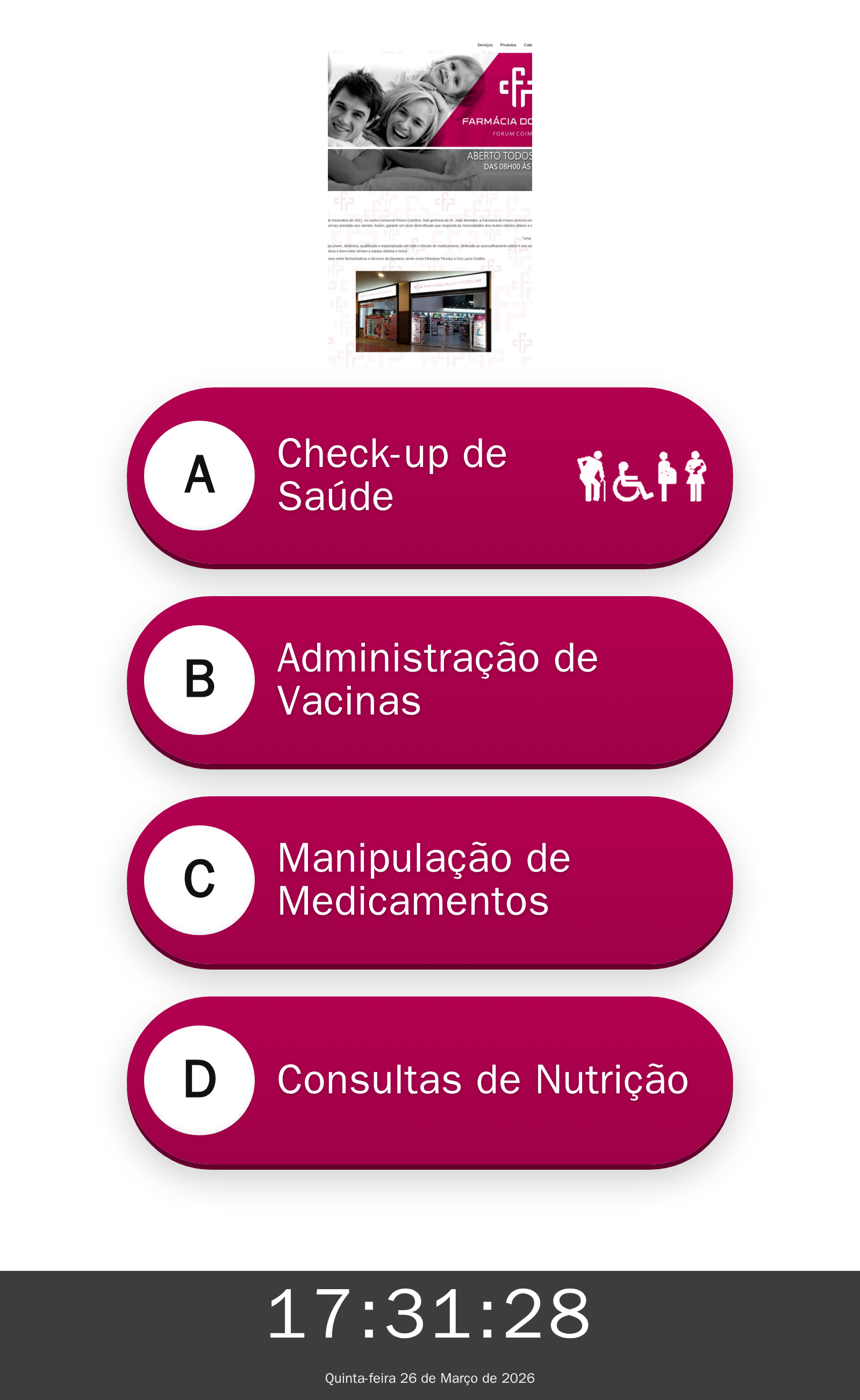 A Logicpulse contacta-vos com o intuito de apresentar a nossa solução Q.track, que poderá otimizar a experiência dos vossos clientes e melhorar o fluxo de espera na vossa farmácia. Sabemos que a Farmácia do Fórum se dedica a promover o bem-estar e a saúde da comunidade em Coimbra, oferecendo serviços como check-ups, administração de vacinas e manipulação de medicamentos.