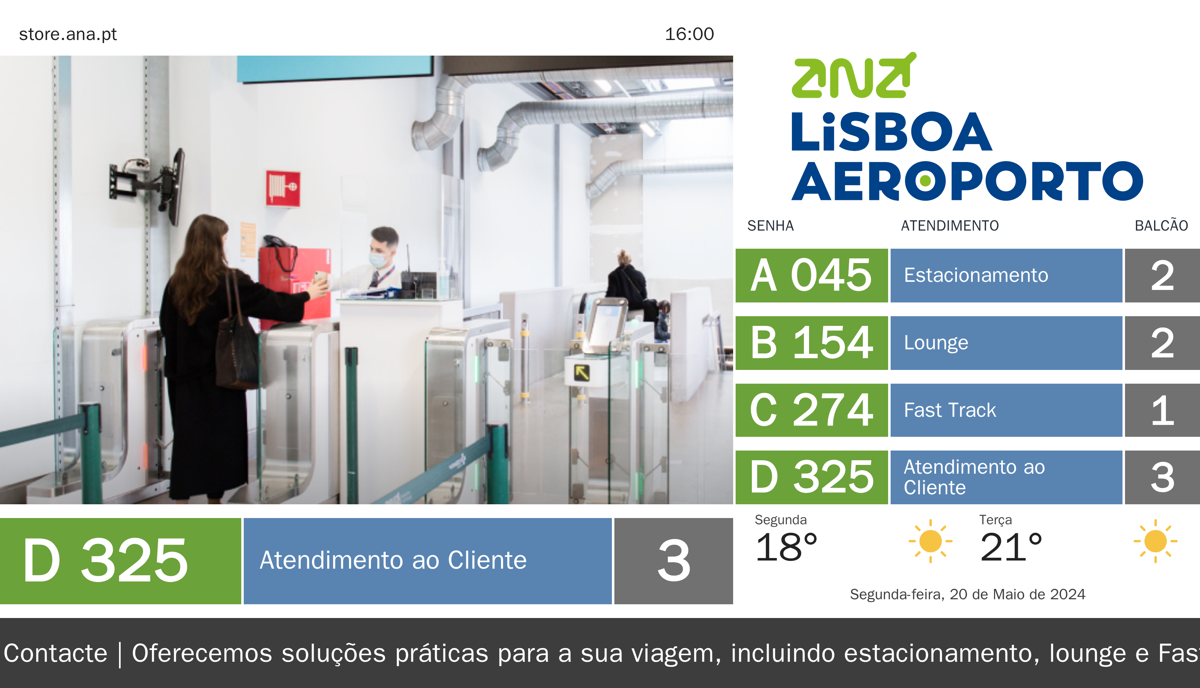 A Q.track é especialmente desenhada para se alinhar à identidade da sua marca, e temos exemplos visuais, como o Q.kiosk e ecrãs que podem ser personalizados com as cores e o logo da Contacte. Acreditamos que estas soluções podem contribuir para a comodidade e rapidez que a sua empresa já oferece através dos serviços de estacionamento, lounge e Fast Track.