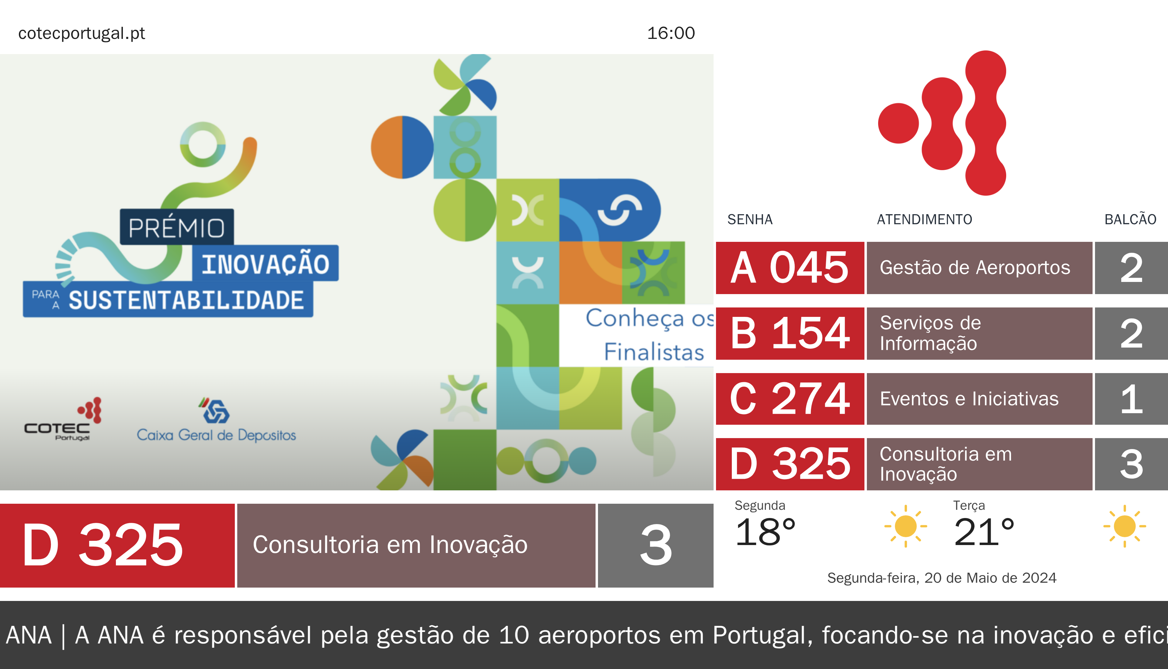 Contactamos a ANA porque reconhecemos o seu compromisso com a inovação e eficiência na gestão dos aeroportos em Portugal. A nossa solução, Q.track, pode ser um grande aliado na melhoria da experiência dos utilizadores, através de um quiosque de senhas, ecrãs de chamada e TV corporativa.