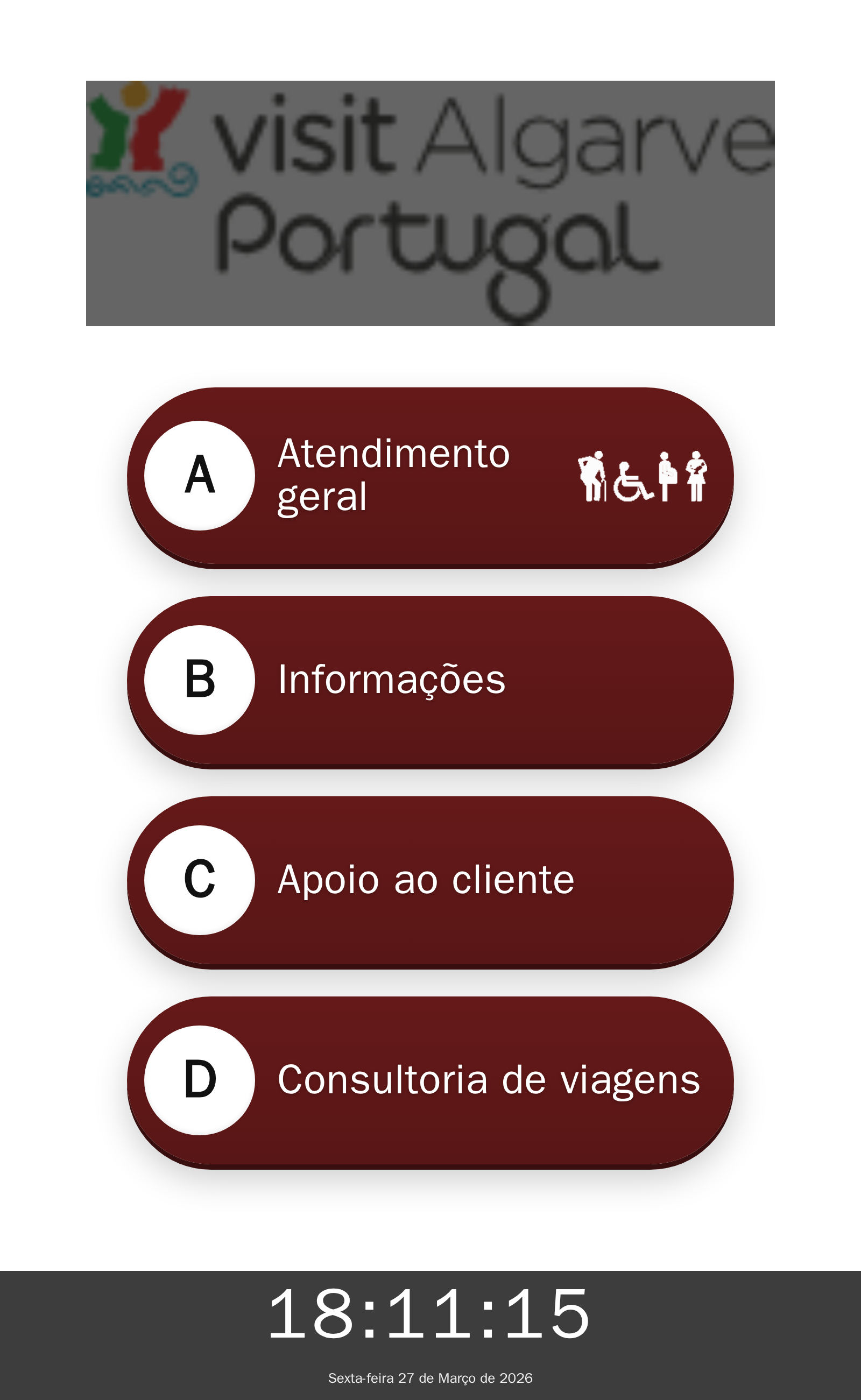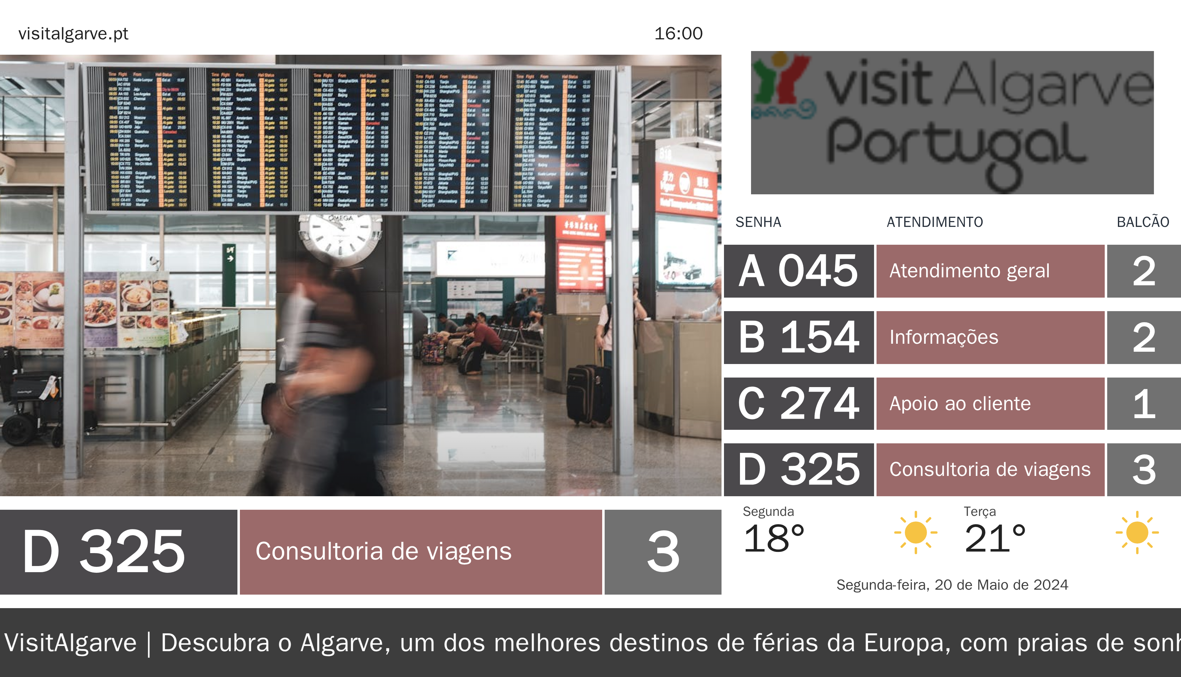 A Q.track oferece um quiosque de senhas, ecrãs de chamada e TV corporativa, que proporcionam um fluxo de espera mais eficiente e uma experiência mais agradável para os visitantes. Com a personalização dos exemplos visuais, como o Q.kiosk e os ecrãs, podemos alinhar a apresentação à identidade visual da VisitAlgarve, garantindo que cada interação reflita a riqueza e tradição da região.