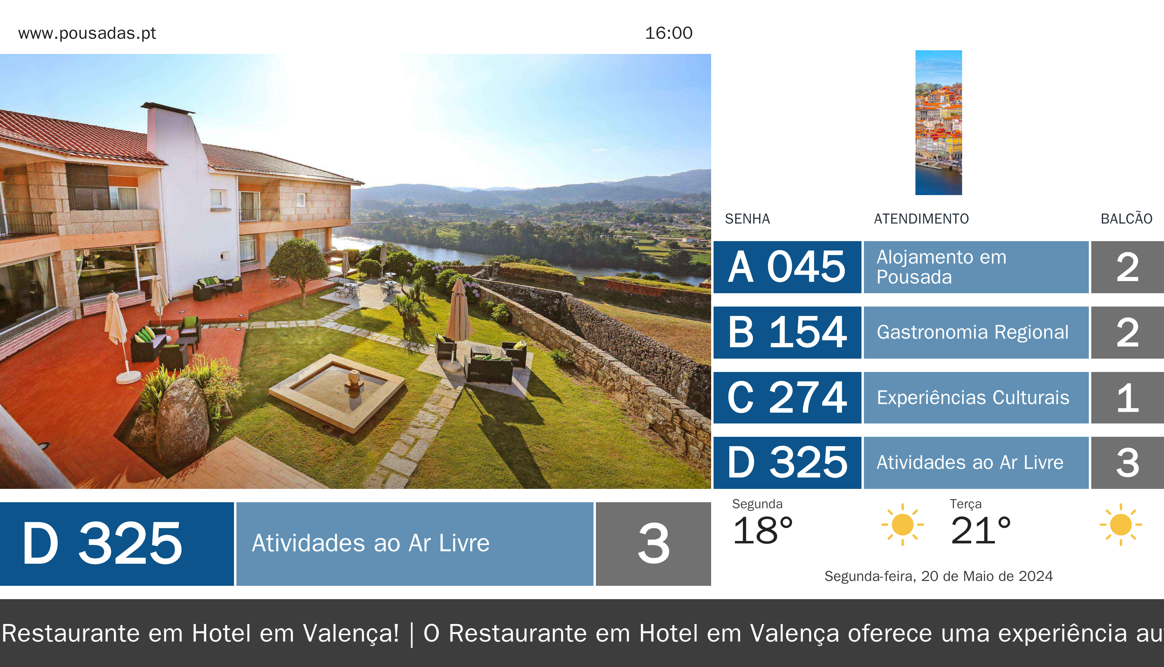 A Logicpulse contacta o Restaurante em Hotel em Valença para apresentar a solução Q.track, que pode transformar a experiência dos seus clientes. Com o Q.track, oferecemos um quiosque de senhas, ecrãs de chamada e TV corporativa, todos alinhados à identidade do seu restaurante, proporcionando um fluxo de espera mais eficiente e agradável.
