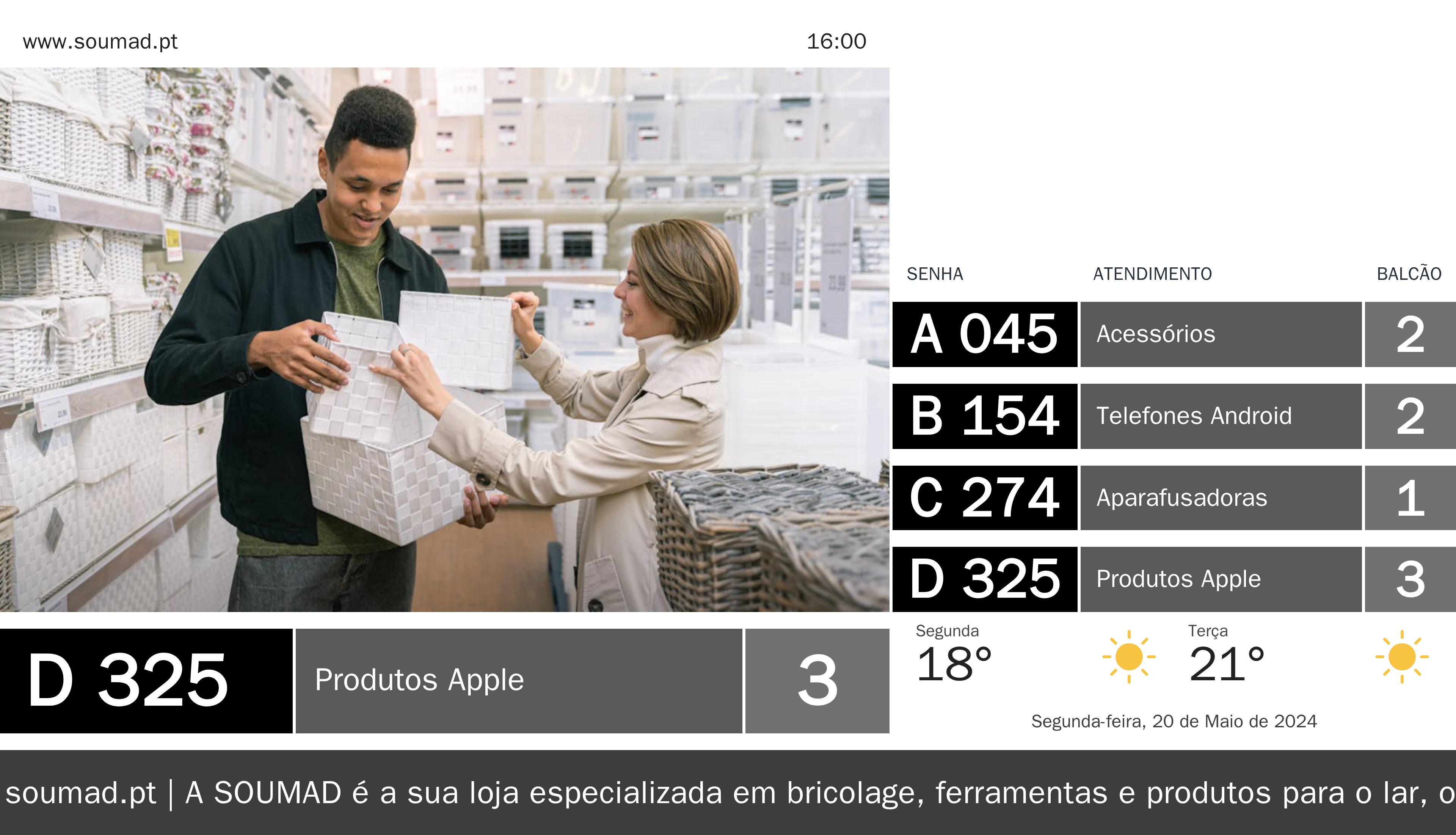 Preparámos exemplos visuais alinhados à identidade da SOUMAD, como o Q.kiosk e ecrãs de chamada, que podem ser personalizados para refletir a vossa marca e oferecer uma experiência única aos vossos clientes.